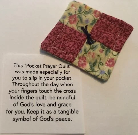 Have you ever heard of “pocket prayer quilts”? Inside each of these small quilts, there is a small cross with a prayer pinned to the quilt as shown in the photo.